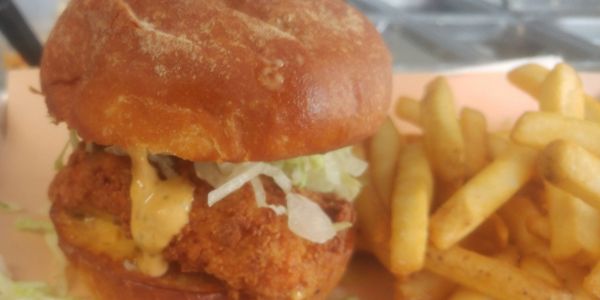 Draper Valley buttermilk brined breast, dredged in our spiced flour and fried golden brown, topped with shredded iceberg lettuce, house made pickles, Bam Pow sauce on a potato bun