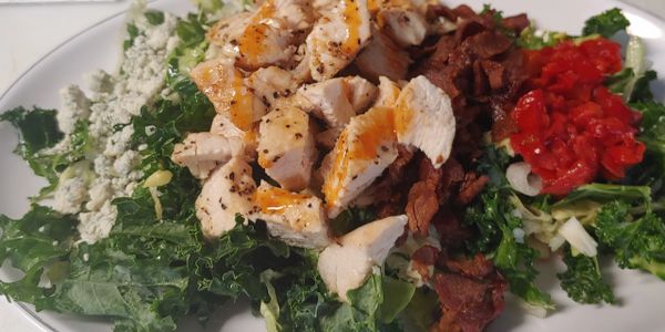 Grilled chicken, Iceberg lettuce,Kale, Cabbage , roasted red peppers, bacon, green onion, blue cheese crumbles with a spicy vin. dressing