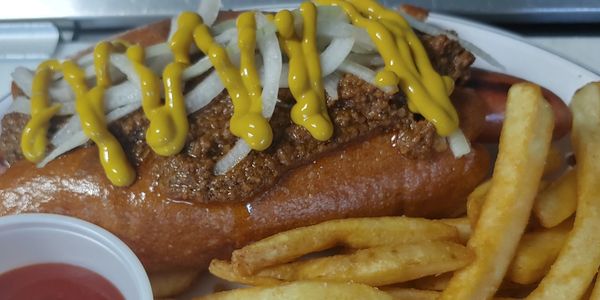 All beef 1/4/lb hot dog, coney sauce, diced onions, French’s yellow mustard